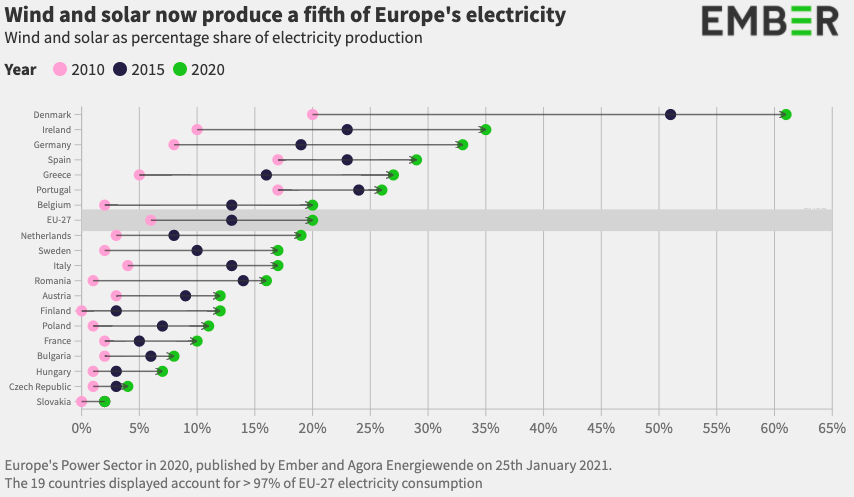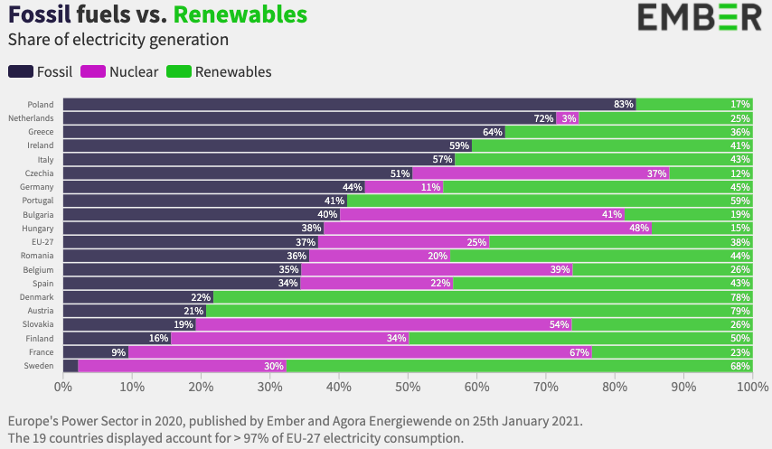 A 2020-as évben, az EU-ban először, több áramot állítottak elő megújuló energia segítségével, mint fosszilis energiahordozókból - olvasható az Ember and Agora Energiewende megjelent jelentésében. A cikk szerint egy hangyányival ugyan, de 38%-os részesedéssel a megújulók legyőzték a fosszilis energiahordozókat, melyek aránya 37%-ra csökkent. A teljes áramfelhasználás 4%-kal volt alacsonyabb 2019-nél.
